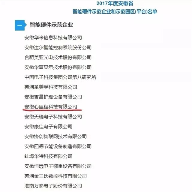 ??2017年,安徽心里程科技有限公司躋身2017年度安徽省智能硬件示范企業(yè)。